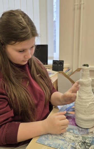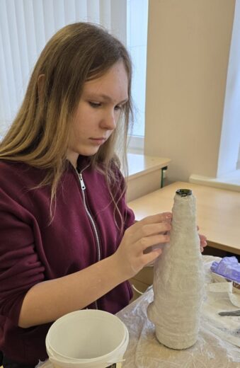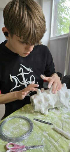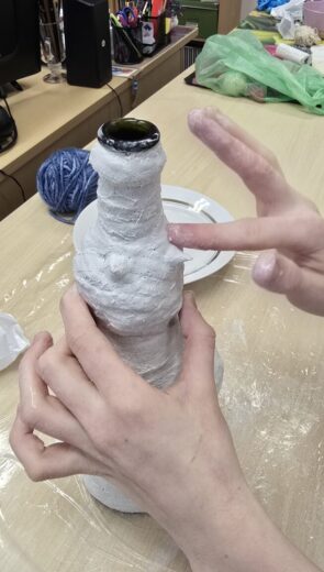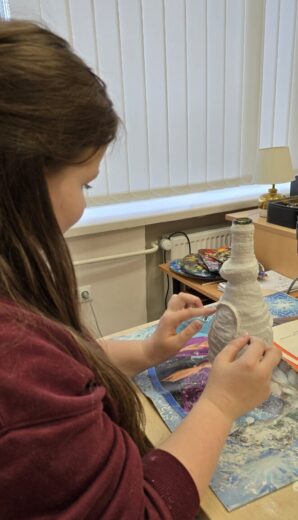 Kai laikas nėra sugraduojamas 45 minučių intervalais ir nelieka tos kasdienės pamokos skubos, lyg ir savaime atsiranda visai kitoks požiūris į kūrybą, įsigilinant į naudojamų medžiagų plastines savybes, galimus dekoro panaudojimo būdus, eksperimentuojant ir ieškant savito kūrybinės problemos sprendimo būdo. Gipsinis tvarstis, dažniausiai žinoma kaip medicinos reikmėms naudojama medžiaga, puikiai tinka ir įgyvendinant individualius kūrybinius sumanymus susipažįstant su skulptūros pradmenimis.
