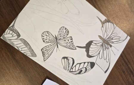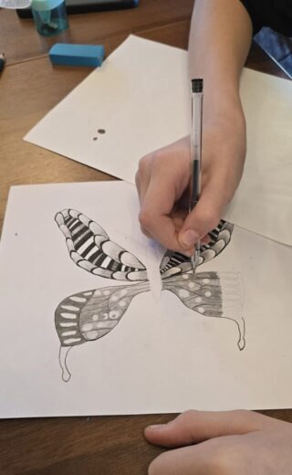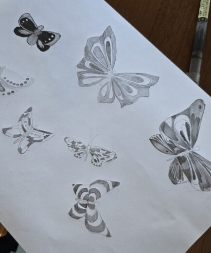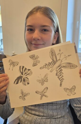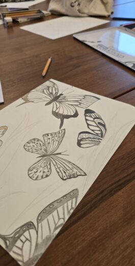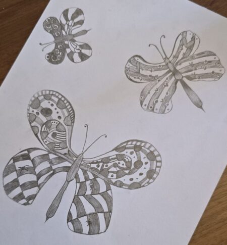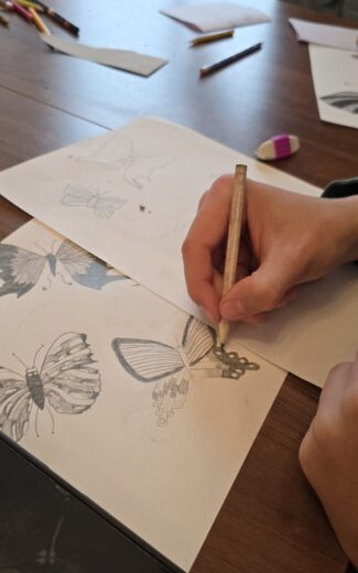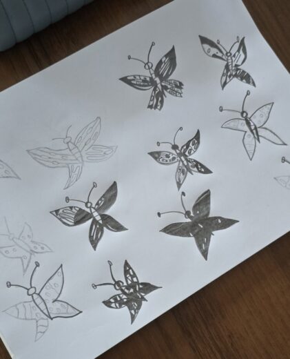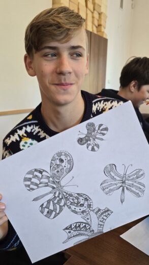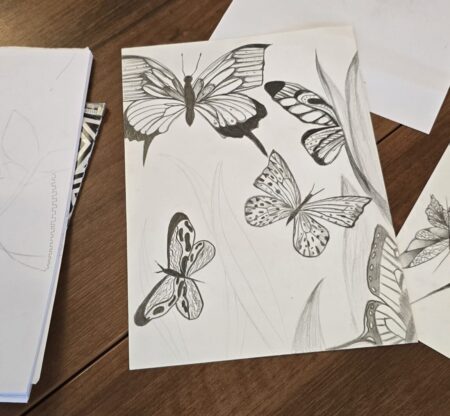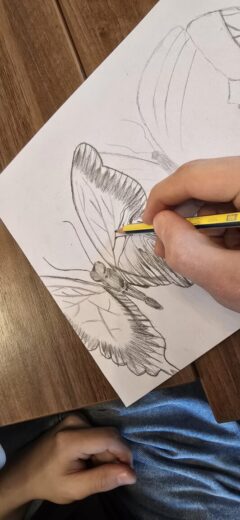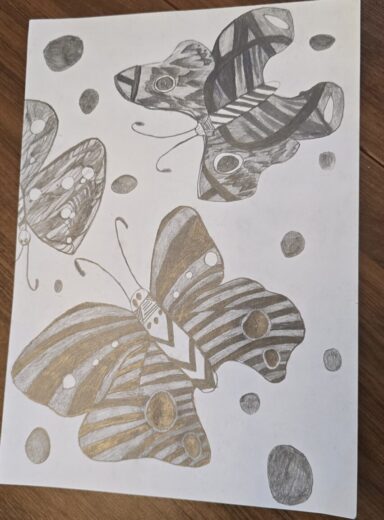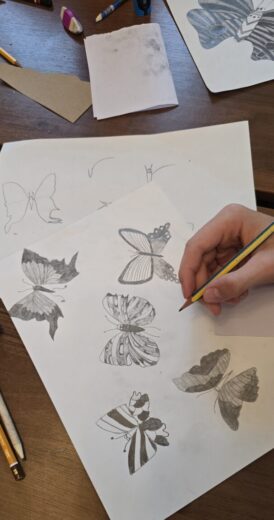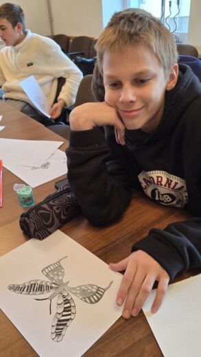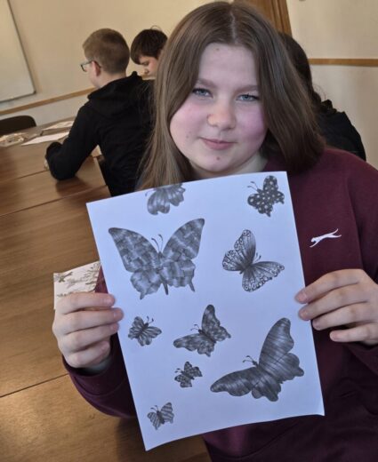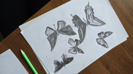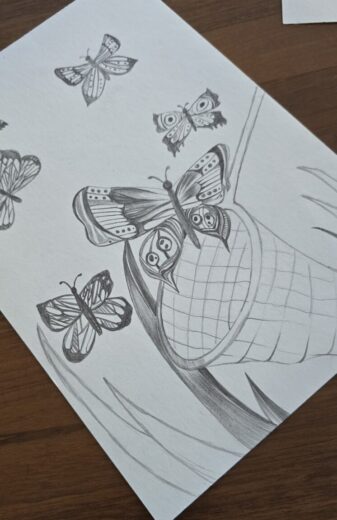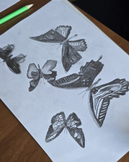 Pieštukas, rodos, tokia paprasta, įprasta priemonė, o kiek ji turi raiškos galimybių: linijų įmantrumo, tonų ir pustonių, gebėjimo sukurti pasakiškus ornamentų derinius, užpildyti lapo plokštumą įmantriomis formomis. Kiekvienas išvydo, įsiminė ir savaip bandė interpretuoti stebėtą Boriso Izambeko dieninių drugių kolekciją. Mokinių piešimo lapuose sugulė simetriškos sparnelių formos, užpildytos stilizuotais raštų motyvais, kontrastingais ornamentų deriniais, vis grįžtant prie kolekcijos ir iš naujo atrandant nepastebėtą, dar neįsimintą.
