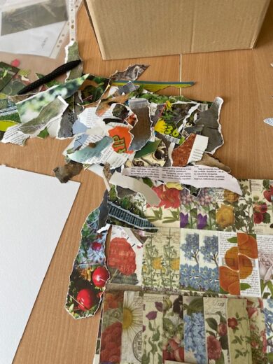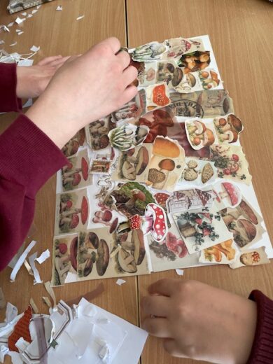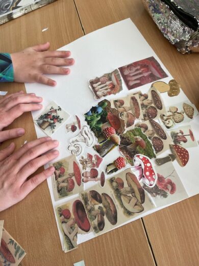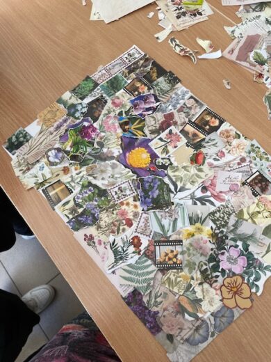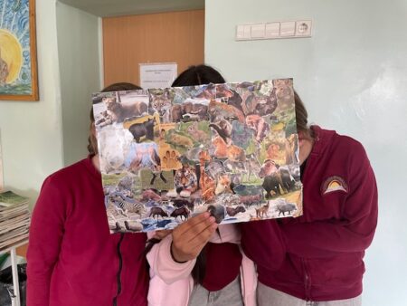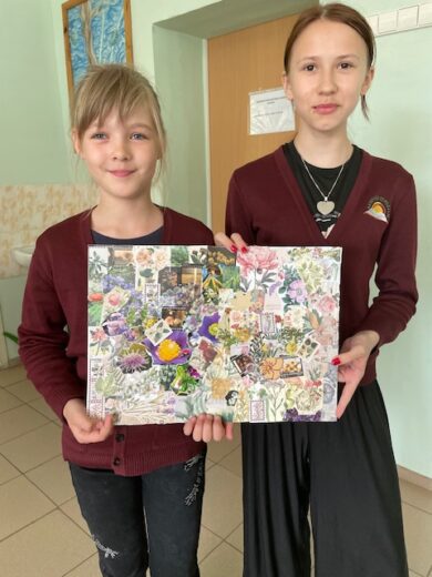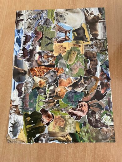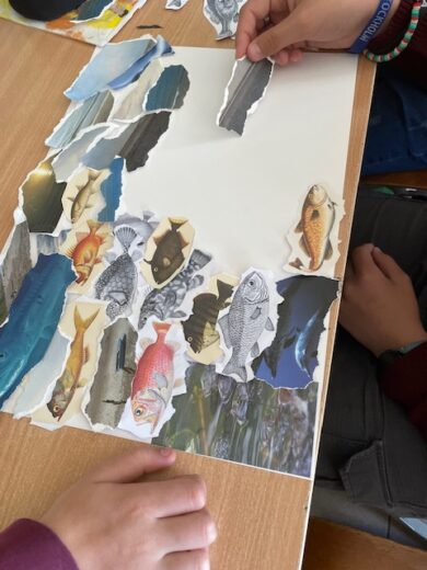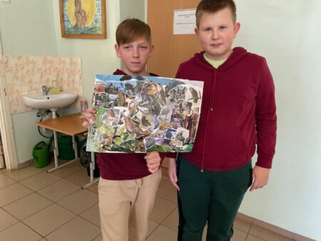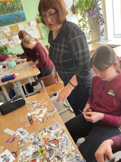 Vaizduotės, pojūčių ir kūrybiškumo lavinimo pratybos „Vaizduotės kelionė“ su penktokais – puikus vaikų kūrybiškumo įrodymas. Pagal TŪM užplanuotas veiklas buvo numatyta kurti darbus koliažo technika. Pasitarusi su mokytoja I.Zubavičiene nusprendėme, kad labai prasminga būtų sukurti gamtinį koliažą. Suskirstėme vaikus į grupeles, kai kas dirbo poroje ir abi klasės dvi valandas nuoširdžiai plušėjo. Ne taip paprasta viską suderinti, padengti visą plotą iškarpomis, kai kiekviena grupė turi savo temą. O temos įdomios – žuvys, paukščiai grybai, žvėrys, drugeliai, vabzdžiai, gamtos spalvos. Dar reikėjo pristatymą padaryti, pavadinimą sugalvoti, vienai klasei teko ir ketureilį surimuoti. Tokie darbai ugdo vaikų kūrybiškumą, kruopštumą, moko bendradarbiauti, ugdo vaizduotę, o toks tikslas TŪM Vizualinių metų programos ir yra.