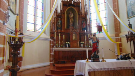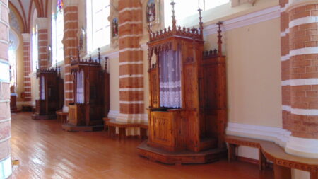 Panemunėlyje mus vedžiojo kraštotyrininkė Violeta Aleknienė, vien dėl mūsų atvažiavusi iš Kupiškio, kad suminėtų daug pavardžių žmonių, gyvenusių ar aplankiusių šį miestelį. Pirmiausia kunigas Jonas Katelė (1831-1908), lietuviškų mokyklų, daraktorių tinklo iniciatorius, knygų platintojas ir 1911 metais baigtos statyti neogotikinės bažnyčios pradininkas. Šviesaus kunigo kapas yra šventoriuje. Bažnyčios statybai daugiausia lėšų skyrė ne tik dvarininkas Kazimieras Sventeckis, bet ir prieškarinės Lietuvos vyriausybės ministro pirmininko J. Tūbelio tėvas Juozapas (vos suminėjus prisimenu jo prototipą išpildžiusį aktorių Karolio Kaupinio filme ,,Nova Lituania“). Bažnyčią pašventino Jono Katelės bičiulis Maironis trečiųjų Jono Katelės mirties metinių dieną. Sakoma, kad ir vidaus kolonų baltos juostos, Maironio patarimu, kas penkta plyta nubaltintos. Klausomės, bet vis rūpi didžiojo altoriaus slaptavietė. Leidžia užeiti, parodo, gal ne tik Matildos dienoraštis tą baisiąją vasarą čia buvo paslėptas, bet ir daug kitų svarbių dokumentų, knygų. Parodo ir vieną iš šešių ąžuolinių klausyklų, dovanotų Matildos tėvo vaistininko Noacho Olkino.