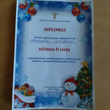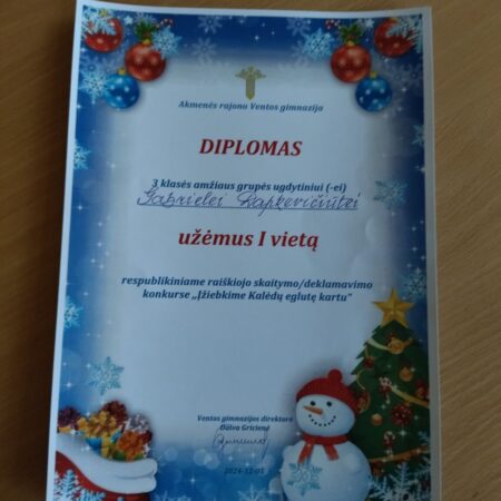 Visą lapkritį uoliai repetavome, o gruodžio pradžioje sėkmingai sudalyvavome Respublikiniame skaitovų konkurse „Įžiebkime Kalėdų eglutę kartu“. Savo pagamintais žaisliukais papuošėme eglutę, patyrėme smagių akimirkų ir gavome dovanėlių. Gabrielė Dapkevičiūtė parsivežė pirmos vietos, o Augustas Sidabras – antros vietos diplomą . Ačiū konkurse taip pat dalyvavusiems: Godai, Vitautei, Karinai, Aronui ir Emiliui.