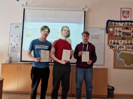 1 vieta: Gustė Majauskaitė (7b), Mindaugas Misgirdas (7b), Urtė Novogreckaitė (7b) – 19.