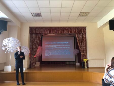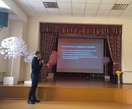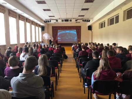 Šiandien mūsų gimnazijoje svečiavosi ir integruotą pilietiškumo bei ugdymo karjerai pamoką 9-12 klasių mokiniams vedė europarlamentarės Aušros Maldeikienės patarėjas/asistentas Algirdas Žiedas, kuris jau aštuntus metus dirba Europos Parlamente. Svečias pristatė EP struktūrą, veikiančias politines frakcijas, komitetus, papasakojo apie EP darbo specifiką, pasidalino savo patirtimis… Taip pat atkreipė dėmesį, kaip priimami ES teisės aktai, kokios yra ES galios ir pan. Antrą pamokos dalį A. Žiedas skyrė diskusijai apie ES suteikiamas galimybes jaunimui ir, deja, vis dar vangų jaunimo įsitraukimą į įvairias pilietines veiklas. Paskutinis pilietiškumo tyrimas parodė, kad 51% jaunimo nuo 16 iki 29 metų Lietuvoje nedalyvauja niekur. Buvo keliamos prielaidos, kodėl Lietuvos jaunimas vis dar bijo įsipareigoti, kas skatina ir kas atgraso nuo dalyvavimo, kur dingusi motyvacija ir pilietinė valia sprendžiant svarbius klausimus… Problemų neišsprendėme, bet apie ką pamąstyti tikrai yra kiekvienam. Ypač, kai pamoką vedė buvęs Akmenės gimnazijos mokinys Algirdas Žiedas, savo pavyzdžiu parodęs, kaip svarbu atrasti savo kelią ir šalia turėti bendraminčių. Tuomet belieka tik aktyviai veikti, stengtis maksimumui ir tikrai pasieksi savo tikslą. Ačiū už pamoką, o mes lauksime kitų susitikimų!