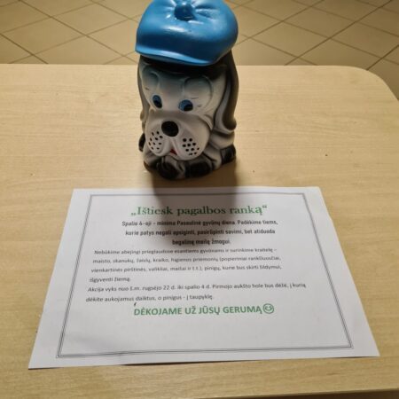 Spalio mėnesio pradžioje gimnazijoje skelbėme akciją „Ištiesk pagalbos ranką“, kuri buvo skirta paminėti Pasaulinę gyvūnų dieną. Joje buvo surinkta 96,40€ ( 7a klasė davė 20 eurų) ir įvairių daiktų (maistas, guoliai, žaislai, higienos priemonės, kraikas ir t.t.).
