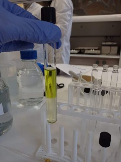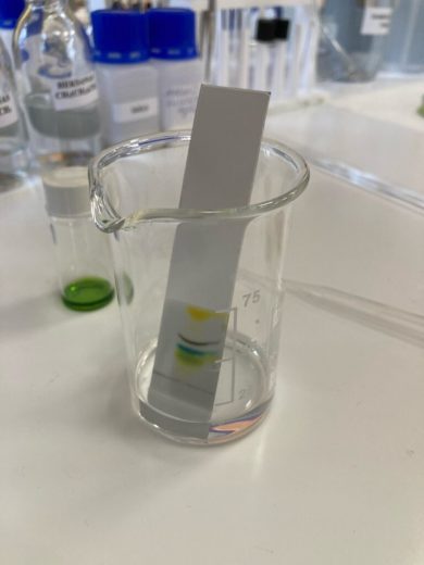 Mūsų veiklos tikslas laboratorijoje buvo įvertinti fotosintezės proceso pigmentų savybes ir išanalizuoti jų sugerties spektrus. Susipažinome su laboratorijoje esančiais cheminiais indais bei cheminiais tirpalais. Savarankišai ruošėme heksaninius pigmentinius ekstraktus. Spektofotometru užrašėme išgrynintų augalų pigmentų sugerties spektrus, juos išanalizavome. Padarius bandymus laboratorijoje gavome rezultatus, kad išsiskyrusių ir identifikuotų augalinių pigmentų sugerties intensyvumas ir bangos ilgis skiriasi.