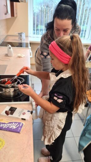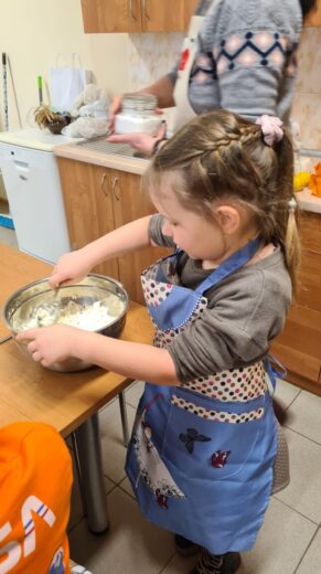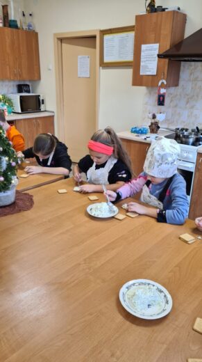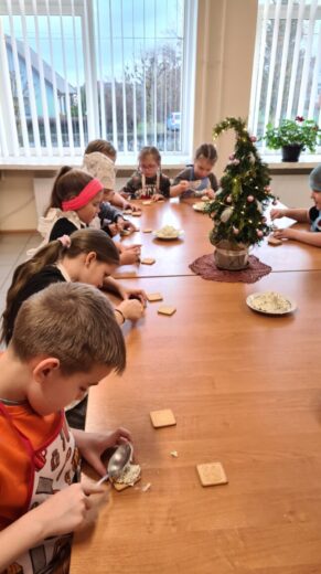 2a klasės mokiniai irgi su nekantrumu laukia švenčių. Jau ne pirmą kartą vykstame į svečius pas technologijų mokytoją Jūratę Stonienę. Šį kartą mokytojos paprašėme priimti ir padėti pasigaminti „Kalėdinius namelius“. Teko ilgai, kantriai trinti kremą, atsargiai lydyti šokoladą. O didžiausias susikaupimo lygis buvo, kai reikėjo atsargiai „statyti“ namelį ir jį dekoruoti. Pavyko, ne tik gražūs, bet ir skanūs „Kalėdiniai nameliai“.