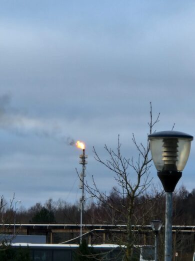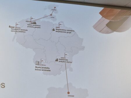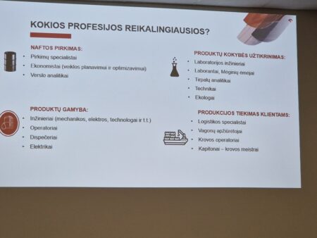 Penktą dešimtmetį (pradėjo veikti 1980 m.) skaičiuojanti gamykla mus pasitiko labai svetingai. Erdvioje salėje Taira mums pristatė trumpą gamyklos istoriją, kaip iš „juodojo aukso“ gaunamas benzinas, dyzelinas ir kt. produktai. Aišku, didesnis dėmesys teko didžiausiam Lietuvos istorijoje kroviniui (apie 1 500 t.), kuris iš Klaipėdos daugiau nei dvi savaites keliavo į šią gamyklą. Jau 2025 m. planuojamas jo paleidimas, padidinsiantis iš naftos išgaunamų produktų kiekį beveik iki 100%. Po pristatymo trumpam buvome palydėti į poilsio zoną, o iš ten į gamyklos autobusą, kuris per pusvalandį, lėta eiga, apvežė po gamyklos teritoriją. Gidas Justinas stengėsi kuo trumpiau papasakoti apie tai, kas vyksta už autobuso lango. Nežinia, kiek kam liko atmintyje jo pasakojimas, bet vaizdai iš gamyklos „miestelio“ tikrai dar ne vienam išliks atmintyje ilgėliau…