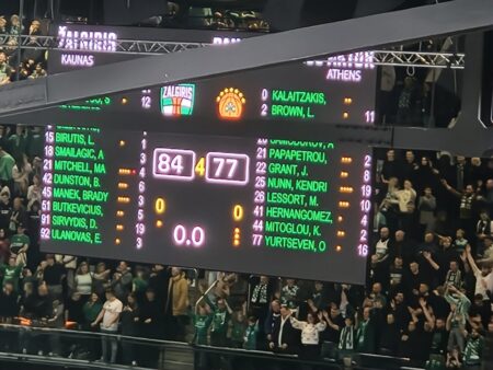 Tuo galėjo įsitikinti praėjusio sezono Eurolygos čempionai iš Graikijos – Atėnų “Panathinaikos”. Jau pirmosiomis minutėmis atliktas efektingas dėjimas nuteikė optimistiškai, kad šiandienos varžybos bus išskirtinės. Ir nesuklydome… Net treneris po rungtynių pripažino, kad ir arena buvo geresnė, nei pralaimėtose varžybose prieš savaitę. Pergalė, Lietuvos kariuomenės dienos šventės išvakarėse Kaune nutraukė žalgiriečių trijų pralaimėjimų Eurolygoje seriją. Belieka tikėtis, kad kauniečiai šiemet nuveiks kažką daugiau nei tik reguliarusis sezonas, nes čia buvo vienintelės šio sezono varžybos į kurias vyko toks gausus būrys Akmenės gimnazijos moksleivių.