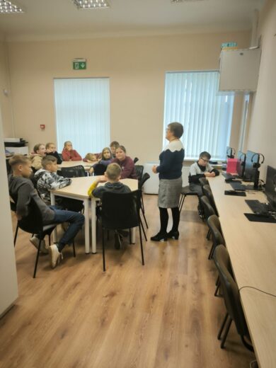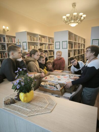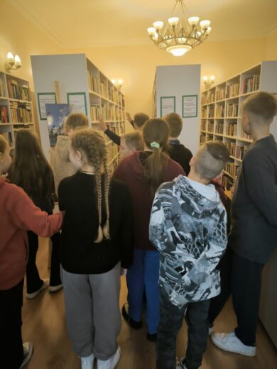 Mokiniai apžiūrėjo bibliotekos patalpas, sužinojo, kodėl biblioteka pavadinta Onos Šimaitės vardu, kiek bibliotekoje yra knygų ir kiek turi skaitytojų.