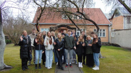 Paskutinę keliamųjų metų ilgojo vasario dieną buvome Kaune su dešimtokais. Laukė muziejininkės dramaturgo Juozo Grušo namuose ir M.K. Čiurlionio paveikslų galerijoje. Dalis (o norėtųsi rašyti – visi) buvo perskaitę ,,Meilę, džiazą ir velnią“, tad norėjosi pradėti nuo kūrėjo namų, kurie nuo 2001 metų Maironio literatūros muziejaus vienas iš šešių padalinių. Dramaturgo šeima šiame name su pertrauka gyveno beveik 40 metų. Surandame ir sąsajų su mūsų kraštu: namas pastatytas 1938 metais, kaip ir pradinė mokykla Akmenėje. Gimė ir augo Kalniškių-Žadžiūnų kaime netoli Šiaulių, per karą gyveno netoli Joniškio, geras bičiulis buvo režisierius ir bendravardis Juozas Miltinis, gimęs mūsų rajone, Ramoniškėse.