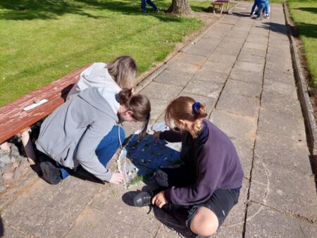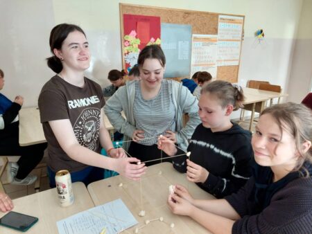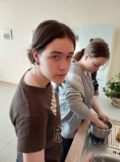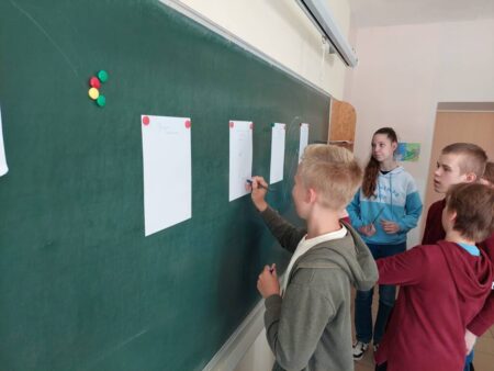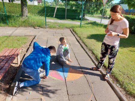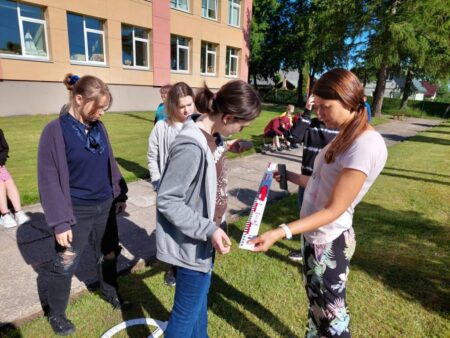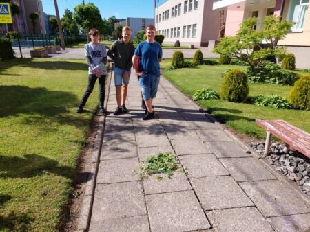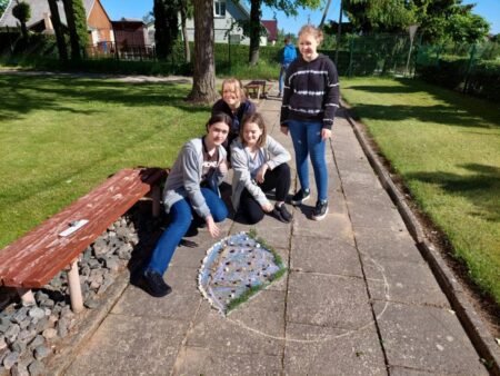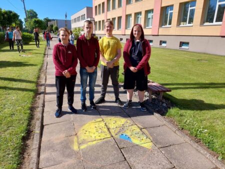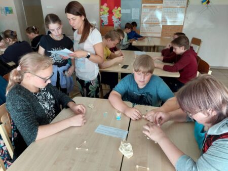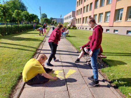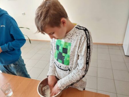 „Kepė pyragą“ mokyklos kieme, dalino gabalėliais (trupmenomis). Minkė druskos tešlą. Medinių iešmelių ir spagečių pagalba statė erdvines ir plokštumines figūras.