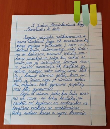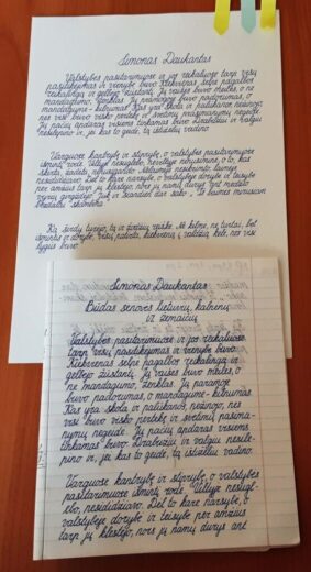 Šešias dienas prieš Kovo 11-ąją dailiai išrašėme Simono Daukanto, Jono Biliūno, Justino Marcinkevičiaus tekstų ištraukas. Kantriai, tolygiai nuo trečioko iki abituriento, įsitraukė ir mokytojai, tėveliai, susegiau visus lapus į aplankalą, jie nepasens ir kalbės apie rankraščio juvelyriką.