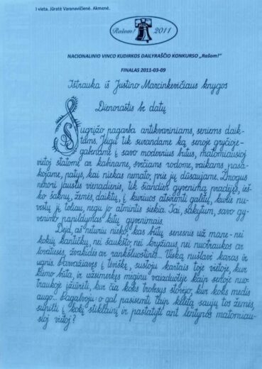 Kovo 11-osios proga pagyrimais ir rašikliais apdovanoti šie dailiaraščiai: Emilija Garalytė (4b), Gustė Majauskaitė (5b), Irūnė Bronušaitė (9b), Karolina Švažaitė (12), o dailių dailiausiai tekstus išrašė aštuntokė Emilija Faberaitė (taip ji rašo ne tik per konkursą), iš suaugusiųjų Raminta Švažienė.