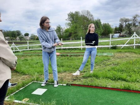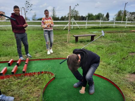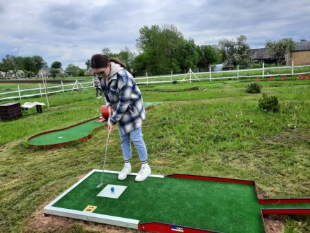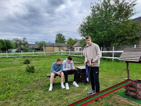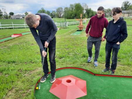 Šiek tiek prisilietę prie krepšinio, likusią dienos popietę smagiai praleidome už Joniškio įsikūrusiame mini golfo aikštyne. Vienintelis toks Šiaulių apskrityje duris-vartus pravėrė visai nesenai – balandžio pabaigoje. 18 aikštelių. Kiekviena vis sudėtingesnė. Tad noras kuo greičiau įridenti kamuoliuką į duobutę, augo kaip ant mielių. Atrodytų paprasta, tačiau…. Bet nepaisant visų neigiamų emocijų savo atžvilgiu, išvengę žadėto lietaus turiningai praleidome laiką gamtoje.