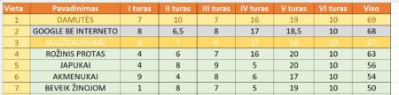 Na, o likusieji turai tradiciniai kaip ir kasmet, tik klausimai – kitokie. Iki pat finišo nebuvo aišku, kas laimės… Po finalinio „fotofinišo“ nugalėtojomis tapo „Damutės“, vos taškeliu aplenkusios „Google be interneto“ ir dviem – „Buožgalviukus“. Visi žaidimo dalyviai ir juos atlydėję mokytojai buvo apdovanoti prisiminimo dovanėlėmis, kurios tikimės paskatins atvykti ir sekančius du penktadienius…