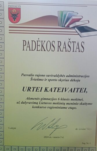 Vasario 3 dieną į trečiąjį meninio skaitymo turą keliavo šeštokė Urtė Kateivaitė. Konkursas vyko dailės darbais turtingoje ir antrą šimtmetį pradėjusioje skaičiuoti Pasvalio Petro Vileišio gimnazijoje. Konkursas kaip šventė su seminaru mokytojams ir dalyviams, kai klausai ir atspėji, kas iš didelio būrio geriausias, įtaigiausias. Džiaugiesi, žvalgaisi ir susivoki, koks svarbus yra raiškiai ištartas žodis. Džiaugiamės, kad buvome tame dideliame būryje, Urtę lydėjo mama Rimantė ir aš, antrus metus jos mokytoja. Urtės rankoje ne tik gimnazijos padovanota knyga… Tad pasirinkimo ir mokymosi laikas tęsiasi.