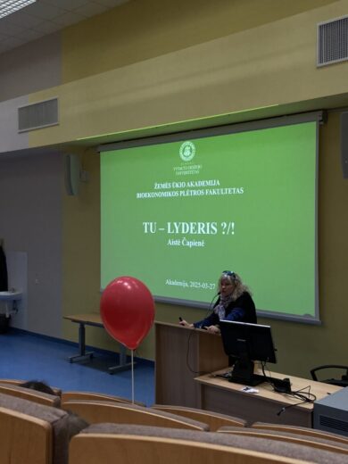 Buvo džiugu matyti jau savo srityse veikiančius lyderius. O apie lyderystę plačiau papasakojo docentė Aistė Čapienė. Jos paskaita priminė, kad mūsų sėkmė priklauso tik nuo mūsų pačių. „Lyderiais tampama veiksmais, ne žodžiais“, – pabrėžė docentė, akcentuodama, jog siekiant tikslų būtina nustatyti konkretų terminą, nes kitaip jie gali taip ir likti neįgyvendinti. Įgiję motyvacijos, toliau gilinomės į žemės ūkio sektoriaus spartų augimą ir jo perspektyvas.
