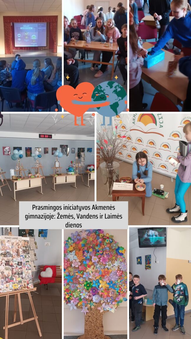 Kovo 20-ąją Akmenės gimnazijoje buvo minimos net kelios prasmingos dienos – Pasaulinė Žemės, Vandens ir Laimės diena. Bendruomenė buvo pakviesta pasipuošti mėlynu akcentu, simbolizuojančiu vandenį. Informaciniai stendai priminė apie vandens svarbą žmogaus organizmui. Neapsieita ir be gardžių skonių – visi galėjo paragauti sulos bei vaisiais ir daržovėmis pagardinto vandens. Skambant raminančiai vandens čiurlenimo melodijai, grožėjomės pradinių klasių mokinių kūrybinių darbų paroda, skirta Žemės dienai, sėdėjome ant „Laimės suolelio“, ieškojome žodžių laimei apibūdinti, klijavome laimės koliažą. Visos veiklos gimnazijoje kvietė stabtelėti ir pagalvoti apie laimę bei gerą savijautą.