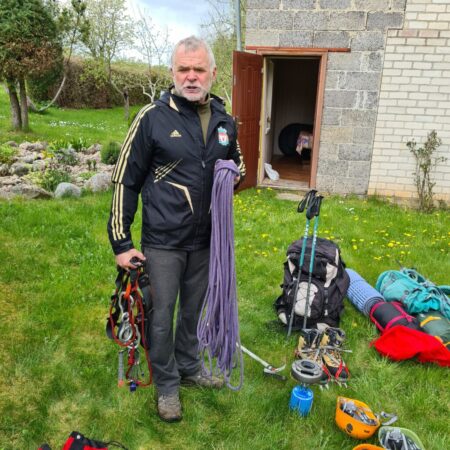 Pirmoji stotelė – Ventos gimnazija, kur mūsų laukė kalnų žmogumi tituluojamas fizinio ugdymo mokytojas, sportininkas, žygeivis Vytautas Šiurkus. Iki jo „valdų“ Purvių kaime keliavome šnekučiuodamiesi apie keliones, „susirgtą kalnų ligą“, sportą, ypatingus nuotykius kopiant į viršūkalnes. Mokiniams aprodė savo pasodintų medžių (daugiau nei 20 metų) puoselėjamą teritoriją, papasakojo iš kur buvo parvežti sodinukai. Supažindino ir parodė reikalingą įrangą, aprangą, kokia turi būti keliaujant į kalnus. Vaikai galėjo ant savo pečių panešti daugiau nei 15 kg sveriančią kuprinę, pasimatuoti alpinistų batus ir išbandyti aukščio baimę, paruoštoje mokytojo Vytauto trasoje.